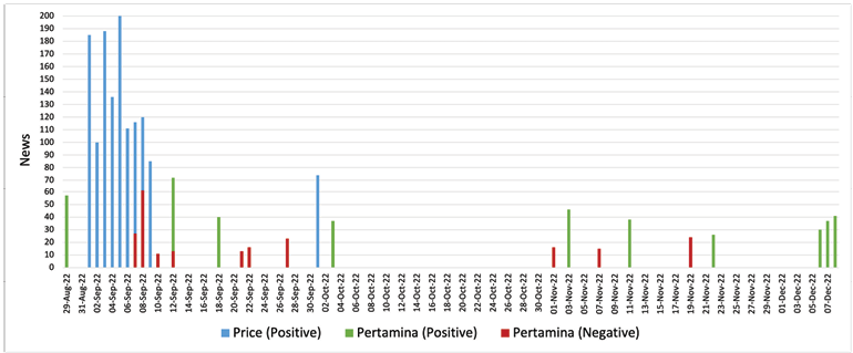 On the contrary, the media conveyed the diminish strategy positively for the “price” entity in similar discourses. The discourses constructed the idea that the natural conditions of Indonesia’s archipelagos and large populations caused high distribution costs and fuel prices compared with other countries. Hence, the researchers insist that these discourses framed the government’s policy regarding fuel prices as the best decision for the country’s unique conditions. However, the discourses primarily occurred in the first few days before and after the fuel price hike announcement, which highlighted the government’s policy and its justification (Figure 2). The discourses in the subsequent weeks emphasized the negative impacts of the policy and shifted the focus from the entity “price” to “Pertamina.” Instead of showing disagreement towards the policy, the discourses conveyed negative sentiment towards Pertamina as the company responsible for the policy’s operational aspects, including the negative impacts. Nevertheless, positive discourses for ‘Pertamina’ were distributed evenly over time (Figure 2).
