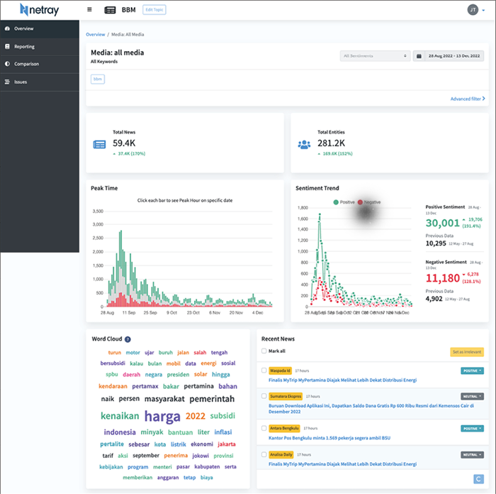 Several studies in sentiment analysis collected data using keywords relevant to the research topics (Amelia, 2023; Catalani et al., 2021; Jung et al., 2022). The Indonesian term for fuel oil is „BBM“ (Nurbagja et al., 2023). Thus, this research used „BBM“ as the keyword to retrieve news data about the fuel price hike. This research utilized the Netray monitoring tool to collect news data from 708 Indonesian online news media listed in Netray‘s database. Several crisis sentiment analysis studies collected three-month data (Desai, 2021; Luo & Mu, 2022; Rahmanti et al., 2022). Therefore, the researchers decided to collect news data for at least three months surrounding the fuel price hike announcement on September 3rd, 2022. The researchers expanded the data collection period from August 28th to December 13th, 2022, to cover various crucial issues.