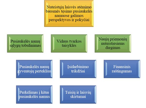 Tyrimo metu aiškintasi, ką ir kaip reikėtų keisti pusiaukelės namuose, kad nuteistųjų resocializacija vyktų dar efektyviau. Išanalizavus tyrimo duomenis, išskirtos trys temų grupės (3 pav.), atspindinčios tobulintinus nuteistųjų resocializacijos pusiaukelės namuose aspektus.