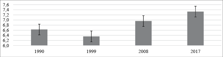 Figure 2. Dynamics of the level of perceived control in Lithuanian society in 1990–2017 (mean on a scale from 1 to 10 with 95% confidence interval)