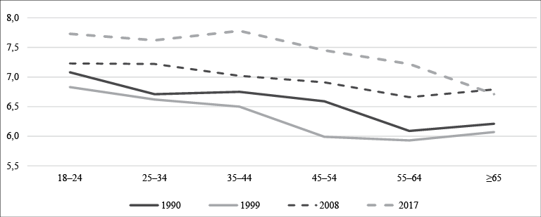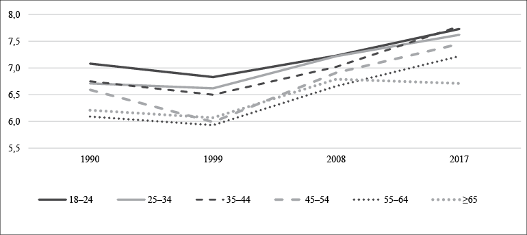 Figure 5. Perceived control in different age groups 1990–2017 (mean on a scale of 1 to 10)