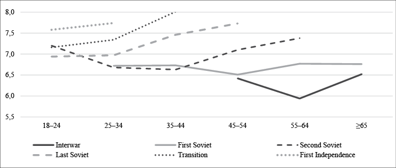 Considering the outlined methodological limitations and their proposed solutions, let us first examine the interaction effects of different factor pairs – the period and age, the period and social generations, as well as social generations and age – on the perceived control of Lithuanians. The analysis of the interaction between the period and age reveals long-term trends in the level of perceived control across different age groups: in all age groups, a decrease in perceived control is evident in 1999, followed by a significant increase in later EVS waves. The only exception to this trend is the oldest age group, where the level of perceived control slightly decreased in 2017 (see Figure 3). It is likely that this weakening of perceived control in the oldest age group is at least partly related to difficulties in adapting to rapid technological changes, which, particularly in recent years, have permeated all areas of life (including public services) and altered the traditional ways of functioning in the public sphere. However, verifying this hypothesis would require a more detailed study.