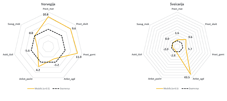 Latvijos atotrūkis tarp nustatytų šaliai tikslų ir faktinių rezultatų yra prastų matematinio, gamtamokslinio raštingumo ir skaitymo gebėjimų srityse (atitinkamai šie rodikliai galėtų būti pagerinti 5,2, 4,2 ir 7,5 procentinio punkto). Kiti keturi rodikliai atitinka nustatytą šalies tikslą arba jį viršija. Panaši situacija buvo Danijoje, Švedijoje ir Prancūzijoje (žr. 2 priedą). Dvi pastarosios šalys kartu su Estija, Airija ir Nyderlandais priskiriamos efektyviai veikiančioms šalims pagal nustatytus rodiklius, todėl šalims nustatyti tikslai yra pasiekti (geltona linija sutampa su nuline juoda linija). Tokiu atveju šios šalys galėtų mažinti atotrūkį tarp faktinių rezultatų ir ES švietimo tikslų (žalia linija). Tarkime, Estija galėtų pagerinti du rodiklius – ankstyvas vaikų ugdymas ir priežiūra bei anksti iš švietimo sistemos pasitraukę asmenys, Airija – prasti matematinio raštingumo pasiekimai, o Nyderlandai – prasti matematinio, gamtamokslinio raštingumo ir skaitymo gebėjimų pasiekimai bei ankstyvas vaikų ugdymas ir priežiūra.