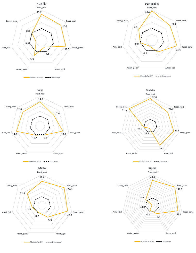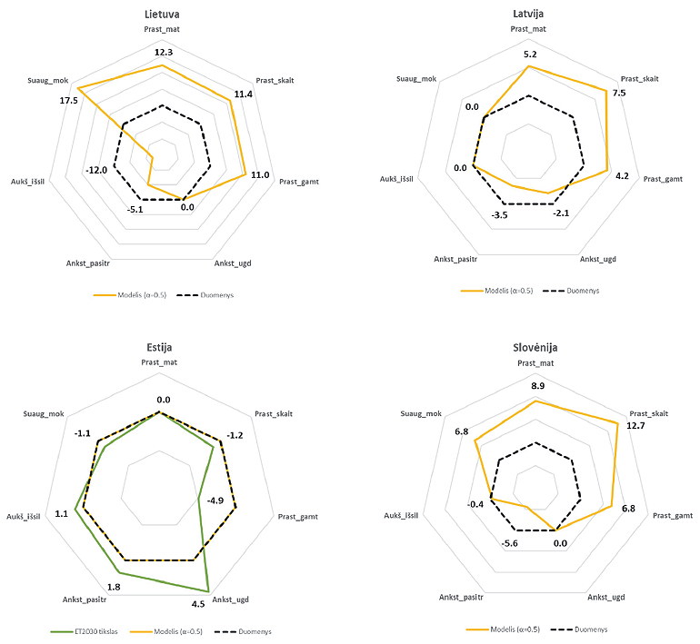 Remiantis gautais rezultatai, Lietuvoje didžiausias atotrūkis tarp nustatyto šaliai tikslo ir faktinių rezultatų yra suaugusiųjų dalyvavimo mokymesi (žr. geltoną liniją) srityje – šis rodiklis galėtų būti pagerintas net 17,5 procentinio punkto, atsižvelgiant į Lietuvos situaciją ir įvertinus kitų šalių padėtį šioje srityje bei nustatytus ES švietimo tikslus. Taip pat prasti matematinio, gamtamokslinio raštingumo ir skaitymo gebėjimų pasiekimai galėtų būti pagerinti daugiau nei 10 procentinių punktų. Kiti trys rodikliai atitinka nustatytą šalies tikslą arba jį viršija. Panaši situacija matoma Slovėnijoje ir Portugalijoje (žr. 2 priedą). Slovėnijoje taip pat turėtų būti dedama pastangų gerinti suaugusiųjų dalyvavimą mokymesi ir prastus matematinio, gamtamokslinio raštingumo ir skaitymo gebėjimų pasiekimus, tik mastas šiek tiek mažesnis nei Lietuvoje.