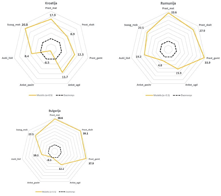 Kroatija, kaip ir Lenkija bei Čekija, turėtų pagerinti rodiklius visose srityse, išskyrus anksti iš švietimo sistemos pasitraukusiųjų srityje, kurioje visos šios šalys jau pasiekė ir viršijo joms nustatytus tikslus. Nustatyti tikslai Rumunijoje ir Bulgarijoje, įvertinus esamą situaciją, atrodo ypač ambicingi. Būtina atkreipti dėmesį, kad, naudojant lyginamosios analizės modelius, yra atsižvelgiama į konkrečios šalies situaciją, tačiau taip pat yra lyginama su efektyviai veikiančiomis šalimis apibrėžtų rodiklių kontekste, todėl šalims, kurių esama situacija stipriai atsilieka nuo kitų analizuojamų šalių, nustatyti tikslai gali būti pernelyg ambicingi, tai matome Rumunijos ir Bulgarijos atveju. Jeigu grįžtume prie atotrūkio tarp faktinių duomenų ir nustatytų ES švietimo tikslų (1 pav.), matytume, kad šios šalys visose srityse yra tarp turinčiųjų didžiausią atotrūkį. Todėl Rumunijai ir Bulgarija galėtų būti taikomas Stumbrienės ir kt. (2024) pasiūlytas modelis, su α reikšme, artima 1, kai tikslui minimizuoti atstumą tarp faktinių duomenų ir šaliai nustatomų tikslų yra suteikiama daug didesnė svarba nei minimizuoti atstumą tarp šaliai nustatomų tikslų ir išorinių tikslų.