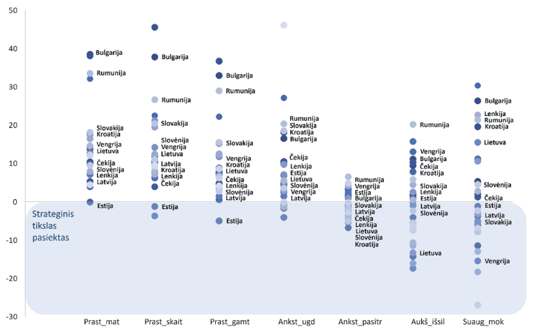 Pristatant 29 Europos šalių rezultatus daugiausia dėmesio buvo skiriama posocialistinėms ES šalims – Lietuvai, Latvijai, Estijai, Lenkijai, Čekijai, Slovakijai, Slovėnijai, Vengrijai, Kroatijai, Bulgarijai ir Rumunijai. Grafike (1 pav.) pateikti skirtumai tarp nustatytų strateginių tikslų ir esamos situacijos Europos šalyse. Šalys, kurios yra žemiau nulinės linijos, numatytus strateginius tikslus pasiekė 2021–2022 metais. Kuo šalis yra aukščiau, tuo didesnis atotrūkis tarp nustatytų tikslų ir esamos situacijos šalyje. Kaip matome, nė viena iš posocialistinių ES šalių nepasiekė nustatyto ankstyvojo vaikų ugdymo ir priežiūros tikslo, o nustatytą prastų matematinio, gamtamokslinio raštingumo ir skaitymo gebėjimų tikslą pavyko pasiekti tik Estijai. Didžiausia variacija matoma suaugusiųjų dalyvavimo mokymosi procese srityje, nepaisant to, kad pusė Europos šalių jau pasiekė šį tikslą, tačiau kai kurios šalys yra toli nuo nustatyto tikslo. Tarp posocialistinių ES šalių Vengrijos šis rodiklis yra aukščiausias, taip pat tikslą pasiekė Slovakija, Latvija ir Estija. Aukštojo išsilavinimo srityje nustatytą tikslą ne tik pasiekė, bet ir gerokai viršijo Lietuva, taip pat tikslą pasiekė Slovėnija ir Latvija. Mažiausia variacija buvo ankstyvojo pasitraukimo iš švietimo sistemos srityje, čia dauguma posocialistinių ES šalių pasiekė nustatytą tikslą.