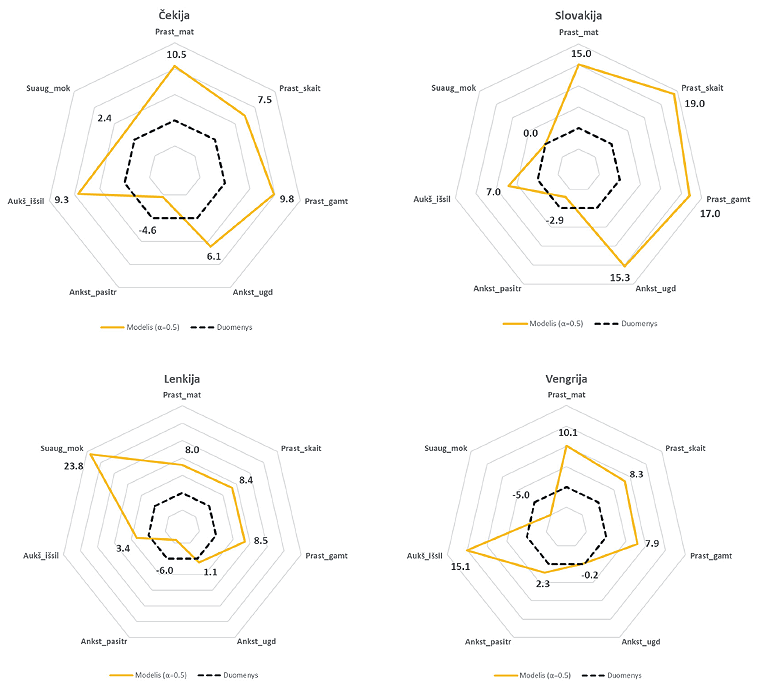 Tikslų įgyvendinimo strategija kiekvienai posocialistinei ES šaliai pateikta kaip atotrūkis tarp faktinių rezultatų ir nustatyto konkrečios šalies tikslo, kai α = 0,5 (geltona linija; 2, 3 ir 4 pav.). Juoda brūkšninė linija (nulinė) yra susieta su konkrečia šalimi ir traktuojama kaip rodiklių pokyčio atskaitos taškas. Taškas virš juodos linijos rodo, kad šalis dar nepasiekė nustatyto tikslo. Taip pat pateikiama, kiek procentinių punktų turėtų būti pagerintas konkretus rodiklis, kad šalis pasiektų jai nustatytą tikslą. Atitinkamai, jeigu taškas yra žemiau juodos linijos, nustatytas šalies tikslas jau pasiektas ir galimai viršytas. Taigi, siekiant, kad būtų įgyvendinta Europos švietimo erdvės strateginė programa, kiekviena šalis turėtų dėti pastangas tose srityse, kuriose tikslai dar nėra pasiekti.