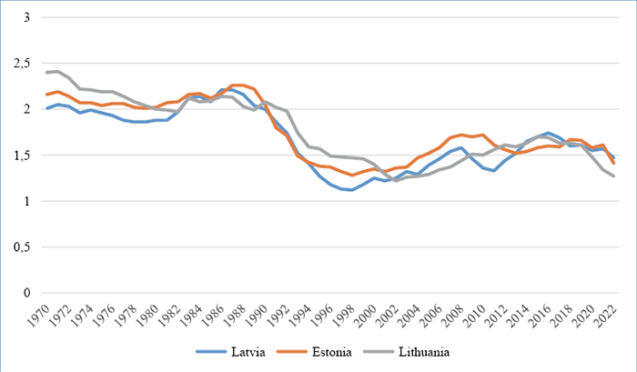 Figure 1. Comparison of fertility trends in the Baltic countries, the total fertility rate (TFR), 1970–2022