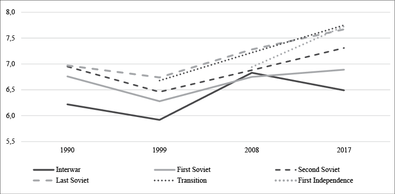 Figure 6. Perceived control in different social generations as they move from one age group to another in 1990–2017 (mean on a scale from 1 to 10)
