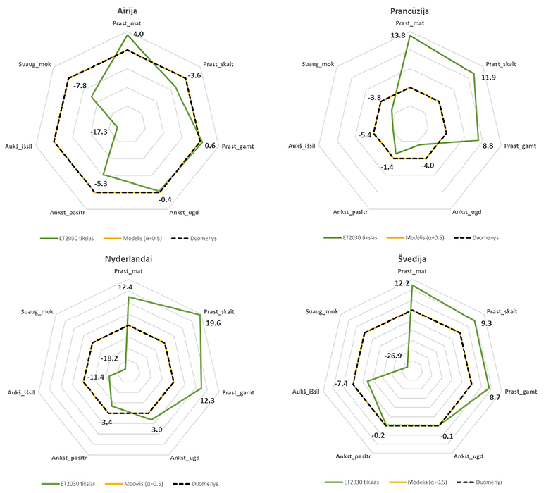 Remiantis gautais rezultatai, Lietuvoje didžiausias atotrūkis tarp nustatyto šaliai tikslo ir faktinių rezultatų yra suaugusiųjų dalyvavimo mokymesi (žr. geltoną liniją) srityje – šis rodiklis galėtų būti pagerintas net 17,5 procentinio punkto, atsižvelgiant į Lietuvos situaciją ir įvertinus kitų šalių padėtį šioje srityje bei nustatytus ES švietimo tikslus. Taip pat prasti matematinio, gamtamokslinio raštingumo ir skaitymo gebėjimų pasiekimai galėtų būti pagerinti daugiau nei 10 procentinių punktų. Kiti trys rodikliai atitinka nustatytą šalies tikslą arba jį viršija. Panaši situacija matoma Slovėnijoje ir Portugalijoje (žr. 2 priedą). Slovėnijoje taip pat turėtų būti dedama pastangų gerinti suaugusiųjų dalyvavimą mokymesi ir prastus matematinio, gamtamokslinio raštingumo ir skaitymo gebėjimų pasiekimus, tik mastas šiek tiek mažesnis nei Lietuvoje.