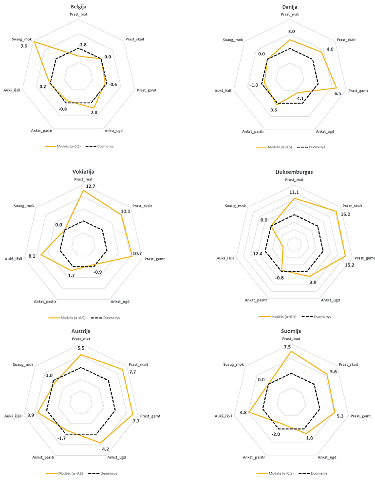 Latvijos atotrūkis tarp nustatytų šaliai tikslų ir faktinių rezultatų yra prastų matematinio, gamtamokslinio raštingumo ir skaitymo gebėjimų srityse (atitinkamai šie rodikliai galėtų būti pagerinti 5,2, 4,2 ir 7,5 procentinio punkto). Kiti keturi rodikliai atitinka nustatytą šalies tikslą arba jį viršija. Panaši situacija buvo Danijoje, Švedijoje ir Prancūzijoje (žr. 2 priedą). Dvi pastarosios šalys kartu su Estija, Airija ir Nyderlandais priskiriamos efektyviai veikiančioms šalims pagal nustatytus rodiklius, todėl šalims nustatyti tikslai yra pasiekti (geltona linija sutampa su nuline juoda linija). Tokiu atveju šios šalys galėtų mažinti atotrūkį tarp faktinių rezultatų ir ES švietimo tikslų (žalia linija). Tarkime, Estija galėtų pagerinti du rodiklius – ankstyvas vaikų ugdymas ir priežiūra bei anksti iš švietimo sistemos pasitraukę asmenys, Airija – prasti matematinio raštingumo pasiekimai, o Nyderlandai – prasti matematinio, gamtamokslinio raštingumo ir skaitymo gebėjimų pasiekimai bei ankstyvas vaikų ugdymas ir priežiūra.