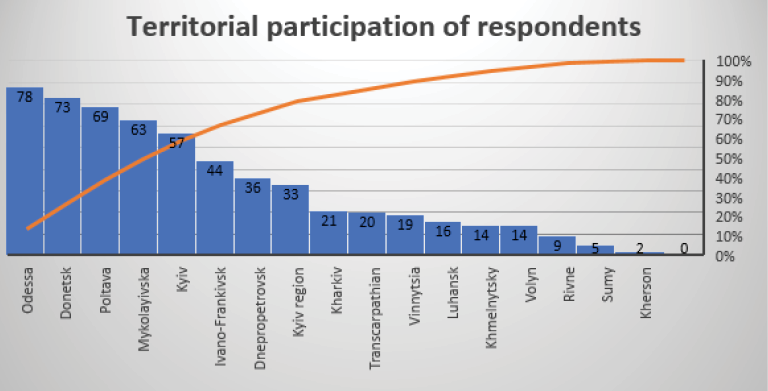 The quantitative ratio of surveyed respondents by territory (oblast) is as follows: (Fig. 3): Donetsk (73 people), Poltava (69), Mykolaiv (63), Kyiv (57), Odesa (54), Ivano-Frankivsk (44), Dnipropetrovsk (36), Kyiv (33), Odesa (24), Kharkiv (21), Zakarpattia (20), Vinnytsia (19), Luhansk (16), Khmelnytsky (14), Volyn (14), Rivne (9), Sumy (5), Kherson (2).