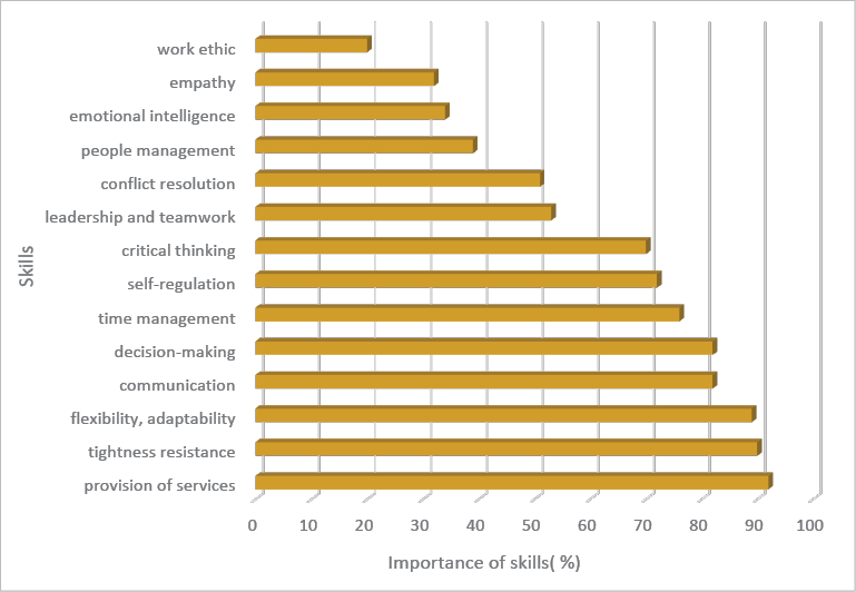 Respondents were also asked to grade skills that they believe are important for the modern expert to perform professional roles and functions (from most to less important skills): critical thinking, stress resistance, analytical thinking, problem-solving, creativity, teamwork, flexibility, adaptability, communication, self-regulation, empathy, respect for diversity, focus on providing services to others, emotional intelligence, people management, comprehensive problem solving, ability to assess the situation and make decisions, work ethic, time management, conflict resolution. The ratio of skills is distributed by respondents as follows (Fig. 4): focus on providing services to others (92%), stress resistance (90%), flexibility and adaptability (89%), communication (82%), ability to assess the situation and accept decision (82%), time management (76%), self-regulation (72%), critical thinking (70%), leadership and teamwork (53%), conflict resolution (51%), people management (39%), emotional intelligence (34%), empathy (32%), work ethic (20%).