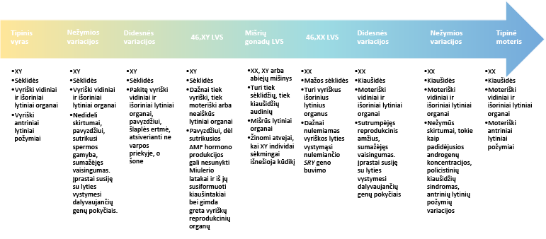Schemoje pavaizduotas laipsniškas lyties perėjimas nuo tipiškos vyriškos iki tipiškos moteriškos, atsižvelgiant į chromosominę ir gonadinę lytis bei lyčiai būdingus fenotipinius požymius. Spektro viduryje pažymėti LVS – lyties vystymosi skirtumai (angl. differences of sex development); AMF – antimiulerinis hormonas. Parengta ir adaptuota pagal (Ainsworth, 2015)