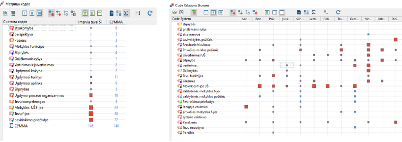 MAXQDA programoje esančios funkcijos, atlikus duomenų abstrahavimą, sudaro kiekvieno informanto kodų sistemas bei pateikia koduotų duomenų ryšių matricas (1 pav.). Švietimo įstaigų vadovų pateiktų duomenų kodų sistemos leido identifikuoti, kad daugiausia dėmesio yra skiriama klausimams, kurie susiję su atsakomybe, atsirandančiomis tėvų funkcijomis ir grėsmėmis ugdymo(si) šeimoje kontekste. Abstrahavus tėvų tikslinės grupės duomenis, kodų sistema leido identifikuoti, kad daugiausia dėmesio interviu metu buvo skiriama tėvų funkcijoms, perimtoms iš švietimo, aptarti. Abstrahuoti duomenys leido išskirti esmines subtemas, jų turinys aptariamas tyrimo rezultatų poskyryje.
