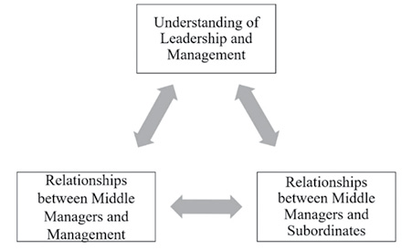 Seven middle managers were invited to the meeting, three of them came to the meeting and the other four joined remotely. The focus group discussion was therefore organised in a mixed mode, using the organisation’s multimedia equipment. Discussion with the participants was constructed in three competency development layers (Figure 3): 1. Middle managers’ understanding of leadership and management; 2. Relationship between middle managers and subordinates; 3. Relationship between middle managers and management.