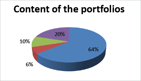 As far as portfolios are concerned, from N = 180, we have the following results: 63.9% of children’s portfolios in preschool institutions contain drawings, illustrations, handiwork, and surveillance protocol, 6.1% children’s photos, 10.0 % didactic material, and 20.0% all (Graph 1).
