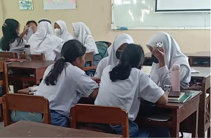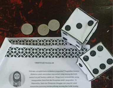Figure 2 shows students doing a simple simulation to understand the problem. Rock paper scissors can be used as an alternative game to introduce the concept of chance. After introducing the problem, the teacher then asks each group to choose dice or coins. This activity supports content differentiation learning by offering students to explore several contexts related to the material they learn. It was found that 3 groups chose to use dice and 4 groups used coins. The teacher provided references through YouTube and Website to help students in problem solving discussion activities.