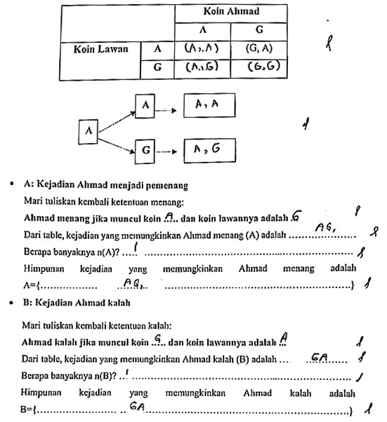 Figure 3 is the condition where students conduct the investigation. The activity that students do during the investigation is to simulate rolling a dice or coin to get a sample point. They also learn to make decisions regarding how to write sample points. Suppose (A, B) represents the number that A got, and B is the number that B got.
