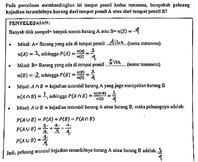 In its application, problem-based learning is carried out with the stages: orienting students, organizing students, guiding investigations and presenting work. The given problem is about the probability of two people taking an item from pencil case.