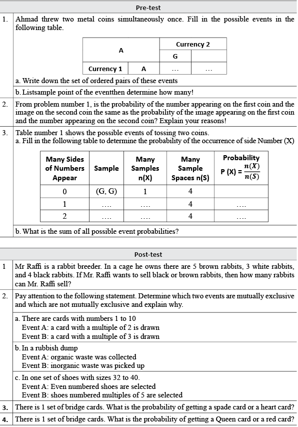 This study required two cycles to achieve the expected success criteria. Each cycle was conducted 2 times a meeting. Before the action began, the researcher conducted a pre-test using questions that were prepared in a form that was easy for students to understand. So, even though students have not yet received learning material, they can still work with their own logic. Based on the data analysis of the pre-test results for cycle 1 (chance and probability distribution) 26% of all students were able to reach the achieved category. In cycle 2 (compound even probability), 15% of all students were able to reach the achieved category.
