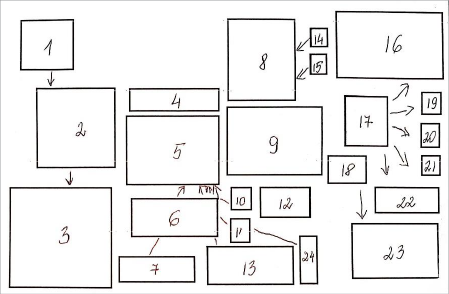 The creation of the first collage made by 3 students of the physiotherapy study programme included 24 pictures. Connections were revealed through 12 arrows. Even though there was no task given to name the work, the students used letters to spell the name reflecting the idea of the collage This is our Everyday Life (Fig. 1).