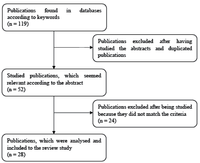 We found 119 open access articles in total. We studied the abstracts and gradually chose 52 articles to focus on, which we further analysed (Figure 1). From the original number of found documents, we excluded those that did not directly address action research as a method of teachers’ professional development. By progressively analysing and reducing the studies to those that matched the predetermined criteria, we obtained 28 relevant studies that were subjected to a more profound analysis.