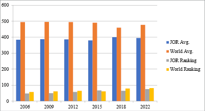 In the inaugural session of Jordanian student participation in 2006, the average performance in mathematics was 384 points, significantly below the international average of 494 points for all 57 participating countries, positioning Jordan at the 48th place globally. In 2009, Jordan topped the Arab world with a general average of 387 points, though it remained below the international average of 495 points for all 62 participating countries, while securing 50th place worldwide. In 2012, Jordan’s average performance reached 386 points, while the general average for the 65 participating countries was 494 points, earning Jordan 57th place internationally. In 2015, the general average dipped to 380 points, and, out of 72 participating countries, Jordan ranked 67th worldwide with an average of 490 points. Finally, in 2018, the general average improved to 400 points, though it still lagged behind the 459-point average for all 79 participating countries, resulting in a 65th-place international ranking. Figure 2 illustrates the performance of Jordanian students in PISA from 2006 to 2018, encompassing Jordan’s participation during this period. Finally, in the year of 2022, Jordan ranked fifth in the Arab world with the overall average of 395 points, and the overall average of 477 points for all participating countries (81), and a ranking of number 75 internationally; Figure 2 shows these results (The Ministry of Education, 2023).