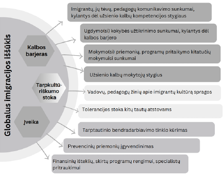Vadovai akcentuoja, kad vienas iš globalių iššūkių yra imigracija [3; 5; 28; 33; 36; 9] (2 pav.), kuri sustiprėjo prasidėjus karui Ukrainoje, kai per kelis mėnesius į Lietuvą atvyko tūkstančiai pabėgėlių ir buvo būtina užtikrinti vaikų integravimą bei įtrauktį švietimo įstaigose. Švietimo institucijose susidarė sudėtingos sąlygos dėl kalbos barjero – jaunesni švietimo vadovai, mokytojai ir vaikai nekalbėjo rusų, ukrainiečių kalbomis, ukrainiečiai – anglų ar lietuvių kalbomis. Taip pat buvo sudėtinga susikalbėti su karo pabėgėlių tėvais. Tai iliustruoja vadovų komentarai: „Prasidedant karui Ukrainoje mūsų ugdymo įstaigoje daugėjo ukrainiečių vaikų, atsirado problema, kaip susikalbėti su vaikais ir jų tėvais, perduodant svarbiausią informaciją (užsienio kalbos barjeras). Taigi, užsienio kalbos nemokėjimas neleidžia reikiamai integruoti vaikus, kokybiškai dalyvauti kituose procesuose – klausyti įvairių konferencijų, seminarų, dalyvauti diskusijose ir kt.“ [3]; „Mūsų įstaigoje veikia lietuvių ir rusų grupės, tad nenuostabu, kad tai paveikia ir mūsų darbo aplinką. Man, asmeniškai teko iššūkis dirbti su rusakalbiais vaikais, kadangi rusų kalba nėra mano stiprioji pusė, jaučiausi labai prastai. Tai palietė mano darbo aplinką, nes jausdavau įtampą, būdavo sunku susikalbėti su vaikais, tėvais. Vadovui tenka didelis stresas. Jaučiu kalbų nemokėjimo ir kompetencijos trūkumą“ [34]. Pažymima, kad nėra kitataučiams pritaikytų programų, todėl visi vaikai turi eiti į bendrojo ugdymo pamokas. Todėl globalus imigrantų integravimo iššūkis yra neišspręstas: „Sunku darosi tada, kai vaikai nekalba ta pačia, lietuvių kalba, tačiau ateina mokytis į lietuvių mokyklą“ [36]. „Tai tapo iššūkiu įstaigai, nes dalis darbuotojų su vaikais negebėjo susikalbėti jokia kalba. Sprendžiant šią problemą, vaikai buvo perkelti į grupes, kurių pedagogai – vyresnio amžiaus, mokantys rusų kalbą“[32]; „Situaciją apsunkino ribota komunikacija, mokymo priemonių bei finansavimo trūkumas“ [33]; „Mokykloje yra keletas mokinių, kurie yra ukrainiečiai, jie mokosi kartu su kitais mokiniais. Tačiau mokytojai susiduria su kalbinės kompetencijos problema, nes ne visi moka anglų, rusų kalbą, tad reikalingas komunikacijos specialistas, o jo mokykla neturi“ [35]; „Viena iš globalių problemų – iš užsienio atvykusių / parvykusių, ukrainiečių vaikų integravimas į Lietuvos bendrojo ugdymo mokyklas. 2022–2023 m. m. mūsų mokykloje mokėsi 28 mokiniai iš Ukrainos, iš jų – 8 mokiniams buvo sudaryta galimybė mokytis paviene nuotolinio mokymo(si) forma Ukrainos mokykloje ir mokytis lietuvių kalbos mūsų mokykloje. Vadovaujantis Lietuvos Respublikos švietimo, mokslo ir sporto ministerijos aplinkraščiu ,,Dėl ukrainiečių vaikų ugdymo 2022–2023 mokslo metais“ – visi mokiniai, atvykę iš Ukrainos, ir registruoti Lietuvos mokyklose, privalo mokytis lietuvių kalbos, užtikrinant bendravimą su bendraamžiais bei sudaryta galimybė dalyvauti ugdymo įstaigos organizuojamose neformaliojo vaikų švietimo veiklose, teikiama būtina švietimo ir mokymosi pagalba, nuolat palaikomas ryšys su vaiku, šeima ir mokykla, kurioje mokoma(si) nuotoliniu būdu“ [25].