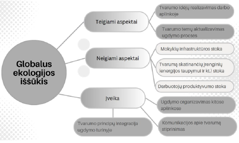 Švietimo įstaigų vadovai mano, kad ekologinės problemos ir klimato kaita (3 pav.) yra reikšmingas globalus iššūkis, kuris veikia švietimo lauką. Patiriamos problemos dėl klimato kaitos yra daugiau infrastruktūrinės kilmės, rodovisuotinį šalies nepasirengimą tokiems pokyčiams: stokojama kondicionierių, langų dengimo priemonės nepritaikytos apsaugai nuo aukštos temperatūros (žaliuzės ar roletai sulaiko tik saulės spindulius, bet ne šilumą). Vadovai nurodo, kad skirtingai sprendžia aukštos šilumos patalpose problemas – vieni ugdymą organizuoja namų aplinkoje, kiti montuoja kondicionierius: „vasaros metu atsirandant karščio bangoms Lietuvoje, administracija nežinojo alternatyvų, kaip padėti mums jas ,,ištverti” (nebuvo kondicionierių ir kt.), t. y. ugdymo įstaigoje nebuvo sudaryta sąlygų būti per tokius karščius, todėl dirbome iš namų“ [3]; „dėl klimato atšilimo kyla problemų organizuojant įstaigos veiklą vasaros laikotarpiu, tenka daugiau dėmesio skirti vaikų ir darbuotojų sveikatai, darbo sąlygoms. Sprendžiant šią problemą įstaigos patalpose atsirado būtinybė montuoti kondicionavimo įrangą, kurios energijos vartojimui įstaiga naudoja atsinaujinančius energijos šaltinius“ [32]; „Kiekvieną vasarą vis aukščiau kyla temperatūra, dažnėja karščio bangos, o tai neigiamai veikia darbuotojų produktyvumą, sutrinka vaikų miego įpročiai, tiek vaikams, tiek pedagogams tampa sunku užtikrinti kokybišką ugdymą(si). Darbuotojams padeda tinkamas uždarų patalpų oro kondicionavimas, vėdinimo gerinimas, pedagogus skatiname planuoti ugdymo procesą atsižvelgiant į oro sąlygas, pavyzdžiui, planuoti lauko veiklas anksčiau ryte, užtikrinti lengvą prieigą prie vandens ir kt.“ [8]; „aukšta oro temperatūra birželio mėnesį iškėlė būtinybę ieškoti sprendimų: galimybių organizuoti ugdymą kitose erdvėse, t. y. įrengti lauko klases, planuoti lėšas oro kondicionierių įrengimui“ [21].