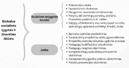 Globaliems iššūkiams vadovai taip pat priskiria socialinės lygybės, lygių galimybių ir įtraukties užtikrinimą (4 pav.). Akcentuojama, kad vis dar nėra visapusiškai užtikrinama vaikų (ir suaugusiųjų) įtrauktis. Išryškinamas visuomenės abejingumas, tėvų nepasitenkinimas. Taip pat akcentuojama pedagogų, mokinio padėjėjų kvalifikacijos tobulinimo svarba, siekiant sėkmingo įtraukiojo ugdymo įgyvendinimo: „Pastaruoju metu žmonės yra abejingi vienas kitam, sunkiai priima kitokį vaiką ar suaugusįjį, nenori įsijausti į jo jausmus, suprasti, padėti. Jei klasėje mokosi vaikas, turintis negalią ar mokymosi sunkumų, elgesio problemų, tai dažnai atsiranda nepatenkintų tėvų, reikalaujančių, kad toks vaikas būtų nedelsiant perkeltas į kitą klasę arba pašalintas iš mokyklos, nes, jų manymu, tokie vaikai negali mokytis bendrojo ugdymo mokyklose, jų vieta yra specialiosiose mokyklose. Dažnai mokykloje Vaiko gerovės komisijos posėdžių metu yra sprendžiamos tokios problemos, kalbamasi su tėvais, ieškoma bendrų susitarimų. Reikėtų skirti ypatingą dėmesį mokytojų rengimui ir jų kvalifikacijai tobulinti, siekti, kad globalusis švietimas būtų sėkmingai integruotas ne tik ugdymo procese, bet ir ugdymo įstaigos gyvenime. Mokinio padėjėjams organizuoti privalomus, nemokamus specialiosios pedagogikos ir psichologijos mokymus, nuolat tobulinti kompetencijas“ [25].