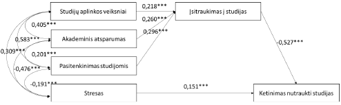 Įgyvendinant trečiąjį tyrimo uždavinį, pasitelkus kelių analizę bei remiantis nustatytais nepriklausomų kintamųjų prognostiniais ryšiais, buvo patikrintas teorinis tyrimo modelis. Jo rezultatai pateikiami 2 pav. Studijų aplinkos veiksniai ir psichologinės charakteristikos (akademinis atsparumas, pasitenkinimas studijomis ir stresas) įvedami kaip nepriklausomi kintamieji, įsitraukimas į studijas – mediatorius, o ketinimas nutraukti studijas – priklausomas kintamasis.