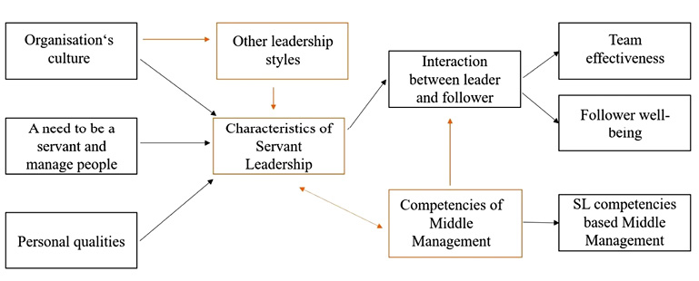 For a long time, middle managers have been perceived as implementers of tactical decisions without contributing to the strategic goals and vision of the organisation. They have been perceived as executors of the organisation’s strategy. The manager’s role was only to ensure that the worker adapted his/her movements to the standard model set (Parera & Fernandez-Vallejo, 2013). Increasingly, however, top managers in organizations are strengthening their delegation competencies, thus extending the range of tasks and functions to middle managers. Middle managers act on behalf of the organisation and create virtuous human systems through corporate social initiatives (Sharma & Good, 2013). Middle management is the natural result of a new organisational structure that originates in a knowledge society (Parera & Fernandez-Vallejo, 2013). In Lithuania, the number of middle managers is growing every year, more organisations are opting for flatter organisational structures (as opposed to hierarchical organisational structures), and the competences of middle managers are no longer sufficient to ensure the smooth, efficient, productive, and sustainable development of the organisation. The involvement of middle managers adds value not only to the implementation of strategy but also to its formulation (Ouakouak, Ouedraogo & Mbengue, 2014). The development of leadership competences of middle managers becomes a critical factor in ensuring that the organisation achieves its objectives. Middle managers’ orientation to their role is entangled with the process of energizing their teams in organisational learning during change (McKenzie & Varney, 2018). Developing financial and personnel expertise are common adult education topics for middle managers (Mosley, 2008). There is a popular saying that an employee does not change jobs because of the organisation, but because of the manager (McCrae, 2020). What does this mean? This can be a crucial message about the role of the leader in shaping the competences of middle managers in an organisation. The question naturally arises: does the leadership of middle managers in an organisation have an impact on the success of the organisation and how? Servant Leadership is a nontraditional leadership philosophy, embedded in a set of behaviors and practices that place a primary emphasis on the well-being of those being served (Greenleaf, 1977). This philosophy is employee-centered, a philosophy that is critically important and relevant today. The value of servant leadership education in the training of future leaders within the helping professions was supported (Fields, Thompson & Hawkins, 2015).