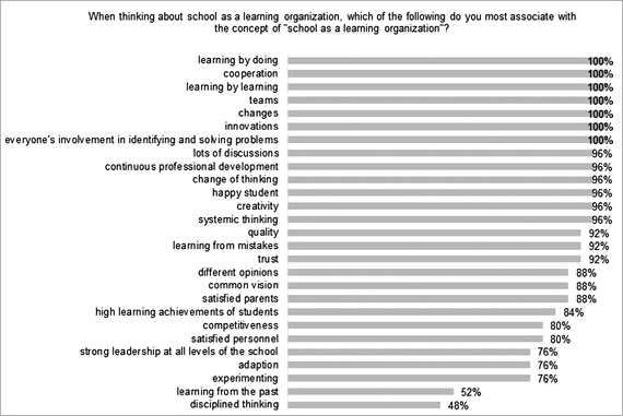 • their associations when thinking about the school as a learning organisation (multiple choice question with 17 possible associations) and the performance indicators of educational institutions in implementing the school as learning organisation (1 question with 31 performance indicators – statements in 3 point scale: is characteristic, partly characteristic, not characteristic)