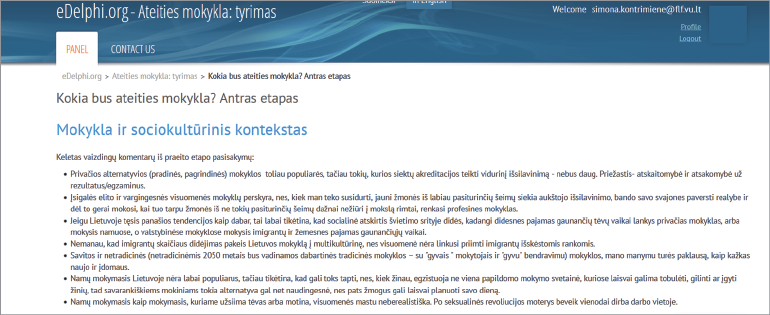 O Lietuva, jos mokykla, kam ji pasirengusi? Delfi tyrimo metu nustatyta, kad Lietuvos ekspertų žvilgsnis į mokyklą stipriai nulemtas IT stiprinimo, labiau nuogąstaujant nei džiaugiantis jų dominavimu. Kur kas mažiau į dėmesio lauką svarstant ateities mokyklą patenka „žalios“ mokyklos idėja, bendruomeniškumas, klimato problematika, taip pat kūrybiškumas, nors ateitis siejama su kūrybiškumo ir komunikacijos kompetencijomis.