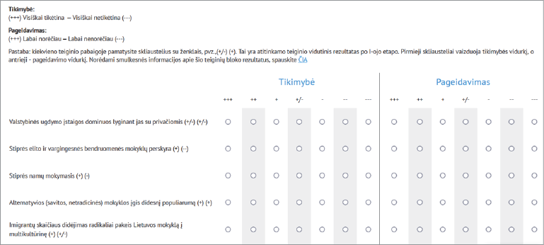 Reikia paminėti, kad, laikantis čia pateiktos tyrimo eigos, mūsų atveju prieš visą Delfi apklausą dar buvo tikrinamas anketos turinio validumas pateikiant teiginius septyniems atsitiktiniams švietimo ekspertams / praktikams. Po pirmo etapo pirminė anketa su teiginiais buvo šiek tiek koreguojama. Įtraukti keli nauji teiginiai reaguojant į įdomius ir toliau tyrimui reikšmingus respondentų atsakymus į atvirus klausimus. Į atvirus klausimus ir uždarus teiginius kiekviename etape anketoje buvo prašoma atsakyti dviem pjūviais: tikėtinumo ir pageidaujamumo (žr. 2 ir 3 pav.).