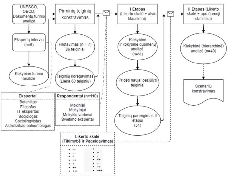 Literatūros apžvalga, taip pat papildomai atlikti šešių specialistų (sociologo, biologo, lingvisto, IT specialisto, filosofo, astrofiziko-paleontologo), vienu ar kitu aspektu susijusių su švietimu, interviu leido parengti anketą ir ja pasitelkus apklausti respondentus pagal Delfi tyrimo metodologiją. Metodologijos ir tyrimo scenarijų kūrimo ir duomenų analizės etapai pateikiami 1 pav.