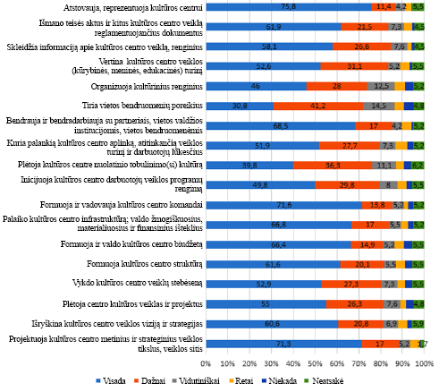 Tarp visada atliekamų populiariausios vadovų veiklos: atstovauja, jį reprezentuoja kultūros centrui (75,8 proc.), formuoja ir vadovauja kultūros centro komandai (71,6 proc.), projektuoja kultūros centro metinius ir strateginius veiklos tikslus, veiklos sritis (71,3 proc.), palaiko kultūros centro infrastruktūrą; valdo žmogiškuosius, materialiuosius ir finansinius išteklius (66,8 proc.), išmano teisės aktus ir kitus kultūros centro veiklą reglamentuojančius dokumentus (61,9 proc.), formuoja kultūros centro struktūrą (61,6 proc.), išryškina kultūros centro veiklos viziją ir strategijas (60,6 proc.).