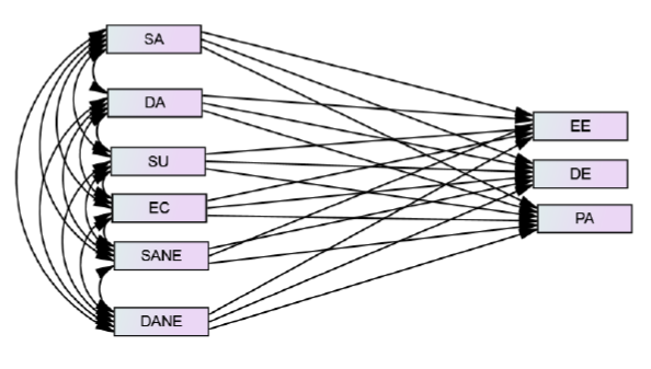 Note: SA: Surface acting, DA: Deep acting, SU: Suppression, EC: Emotional consonance, SANE: Surface acting negative emotion, DANE: Deep acting negative emotion, EE: Emotional exhaustion, DE: Depersonalization, PA: Personal accomplishment.