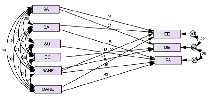 The results show a positive direct effect of surface acting on emotional exhaustion and personal accomplishment. There is also a positive direct effect of deep acting on emotional exhaustion and personal accomplishment, a direct effect of suppression on personal accomplishment, a positive direct effect of emotional consonance on depersonalization, and a positive direct effect of surface acting negative emotion on emotional exhaustion and personal accomplishment. On the other hand, there is a negative direct effect of surface acting negative emotion on depersonalization and a positive direct effect of deep acting negative emotion on emotional and personal accomplishment.