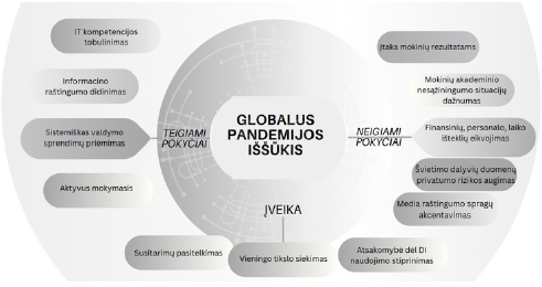 Vadovai įvardija globalaus pandemijos iššūkio nulemtus pokyčius (1 pav.). Pažymima, kad šiuo laikotarpiu visa švietimo bendruomenė stokojo globalių kompetencijų technologijų taikymo srityje: teko mokytis organizuoti ugdymo procesą nuotolinėje erdvėje [1; 3; 19; 28]; užtikrinti pandemijos valdymą, rengiant vidinius teisės aktus, suderintus su nuolat kintančiais išoriniais (pvz., įteisinti privalomą kaukių dėvėjimą [13]); užtikrinti saugumą (pvz., aprūpinti kaukėmis, jų išmetimo ir utilizavimo priemonėmis [19]). Pagrindine globalios kompetencijos stokos įveikimo grandimi laikomas aktyvus mokymasis, todėl pedagogai, kurie mokėsi taikyti IT, sklandžiau prisitaikė prie pasikeitusių virtualių ugdymo(si) erdvių [1]. Kadangi tai buvo nauja patirtis ir aplinkybės, kurios iš esmės pakeitė ugdymo(si) proceso organizavimą, IT kompetencijų turintys mokytojai sklandžiau organizavo savo veiklą. Pedagogai, stokojantys tokių gebėjimų, mokėsi naudoti informacines technologijas, tai turėjo įtakos akademinėms, socialinėms mokinių žinioms ir kompetencijoms: „pandemija per trumpą laiką privertė visą kolektyvą patobulinti skaitmenines kompetencijas, tačiau mokinių akademiniai praradimai dideli, jaučiami ir šiandien. Tai padarė didelę žalą mokinių socialinėms kompetencijoms. Ateinantys abiturientų tarpiniai patikrinimai mokiniams padės suprasti savo spragas arba jaustis ramiau egzamino metu, tačiau mokyklų turima kompiuterinė įranga nepakankama, padėtų papildomas finansavimas. Reikiamų specialistų trūkumas, įveikti padėtų didesnis darbo užmokestis“ [1].