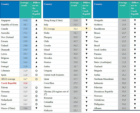 Students’ test scores were converted to a single final scale ranging from 0 to 60, where the highest value corresponds to the sum of the maximum possible scores for all test questions. The average results for all participating countries are shown in Table 1.1. The best-performing countries were Singapore, which also achieved the highest results in mathematics, reading and science literacy (see PISA National Report 2022), followed by students from the Republic of Korea, Canada, and Australia. Czech pupils achieved an average score of 33, which is the same as the average of the participating OECD countries, and their average score was significantly better than the average score of the participating EU countries. Pupils from twelve countries performed statistically significantly better than Czech pupils. Pupils from seven other countries had results comparable to those of Czech pupils, while at the same time, there are countries with results comparable to the OECD average.