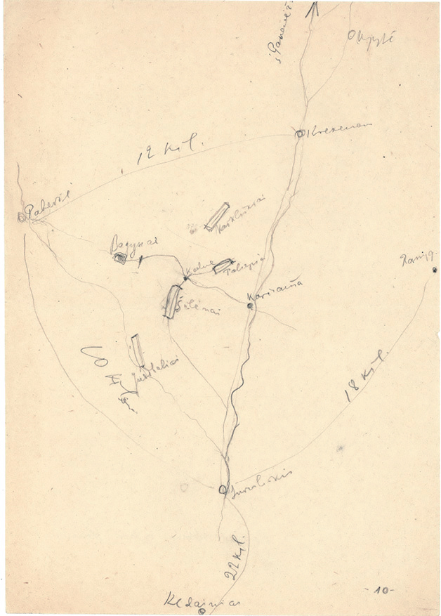 1 pav. Vinco Mykolaičio-Putino sudarytas romano Sukilėliai veiksmo vietovių planas. Pažymėtos Paberžės, Krekenavos, Bagynų, Karkliškių, Paliepių, Šilėnų, Juodbalių, Surviliškio, Upytės vietovės, Panevėžio, Ramygalos ir Kėdainių kryptys, dar kalvė ir karčema (LLTI BRb, l. 10).