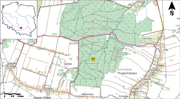 The mining field is located in Southern Poland, in the area of the village of Poręba Dzierżna (site 24) in the Lesser Poland Voivodeship. This is the area of the Kraków-Częstochowa Upland, also known as the Polish Jura (Fig. 1). The site occupies an area of at least 1 hectare on the eastern slope of the Udorka Valley. The valley slopes are relatively steep, and the edges in its lowest part are strongly eroded by the periodically flowing river (Udorka).