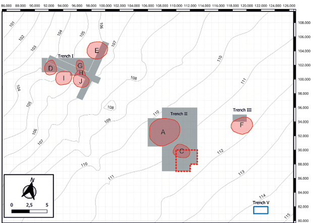 2 pav. Tyrimų perkasų plotai 24-oje Poręba Dzierżna vietovėje. Legenda: pilka spalva – perkasų ribos; mėlynas stačiakampis – 2021 m. geologinė tranšėja; raudoni apskritimai (A–J) – kasybos objektų kontūrai; raudona punktyrinė linija – teritorija, kurioje 2023 m. sezoną atlikti tyrimai, aprašyti šiame straipsnyje toliau.