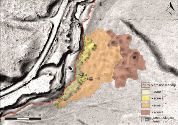 The site is located on a steep Eastern slope of the Udorka Valley. The valley area is covered with dense forest, which made it difficult to locate it and clearly recognize its anthropogenic nature in the first stage of research. The site’s area was estimated as at least 1 hectare based on LIDAR. The mining relief of the terrain has been preserved in an exceptionally good condition to this day. The outlines of shafts and spoil heaps are clearly visible. Based on their external morphology, as revealed by LIDAR, the site was divided into 4 zones (Fig. 3). Closest to the bottom of the valley, there are numerous small niches, opening towards the river. This area is partially eroded by the activity of flowing water. In zone 2, deep depressions with a diameter of up to 3 meters are visible. Further on, there is zone 3, the most extensive of all the separated zones. It occupies a relatively flat area. The outlines of mining facilities are the least visible. In zone 4, the largest niches can be observed, reaching up to 25 meters in diameter. They have not yet been the subject of research; therefore, their chronology and purpose still remain unknown (Sudoł-Procyk et al., 2021, p. 114–116).