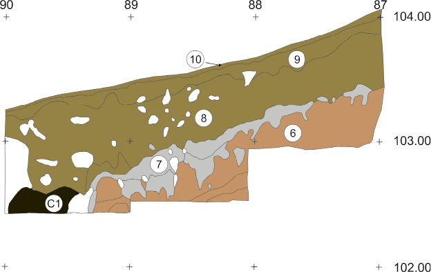 4 pav. Bendra vietovės stratigrafijos schema, sudaryta pagal II perkasos E profilį. 10, 9 – humusingas dumblas; 8 – koliuvio nuosėdos; 7 – priesmėlio sluoksnis, greičiausiai in situ; 6 – in situ sluoksnis; C1 – kasyklos šachtos užpildas; balta spalva žymi įgriuvas ir šaknis.