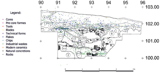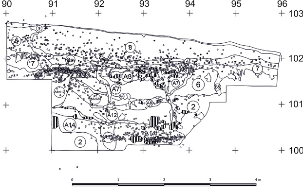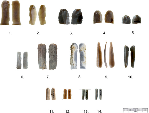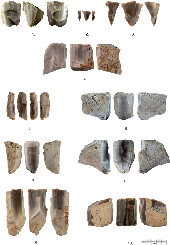 Layer A12 is overlaid by layer A8 and sediments mixed with it. This layer is again rich in archaeological material (298 finds, 3.5 kg). Waste materials constitute 57% of the finds from this layer, while flakes constitute 28%. There were also 20 natural concretions, 11 pre-core forms, mainly in the type of test concretions, 3 blades, 1 core, one technical form, and 1 flake. 10 of the products showed signs of overheating or burning. The characteristics of this assemblage may indicate its connection with the initial stages of processing, with checking the quality of the raw material and preparing the precores.