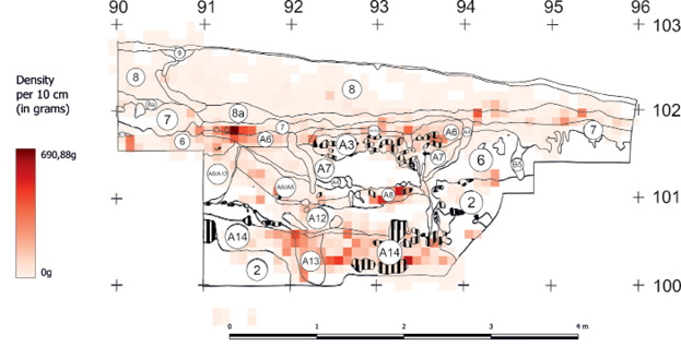Fig 8. A. Profile W at meter 108 from Trench II. A3–A14 – anthropogenic fill layers of structure ‘A’. Areas marked with black lines – limestone rocks; B. Profile W with marked artifacts; C. Profile W with marked artifacts. Burnt or overheated finds are marked in black, while those without such traces are marked in white; D. Kernel density estimation of artifacts taking into account their weight, against the background of profile W.