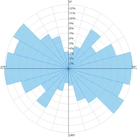 9 pav. Rozetės diagrama, kurioje pavaizduotos 2023 m. sezono II tranšėjos radinių nusėdimo kryptys.